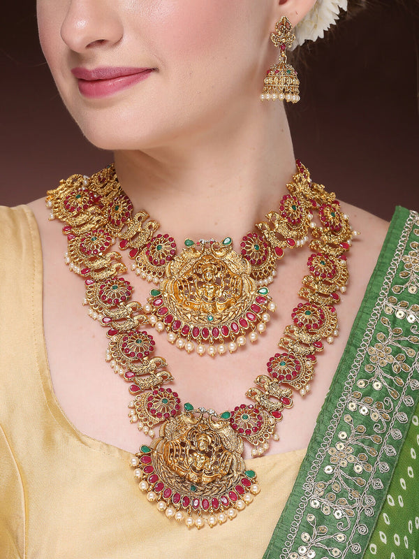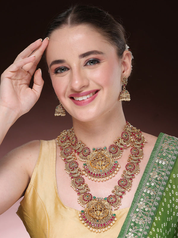 NVR Women's Set of 2 Gold-Polished Green & Pink Stone Studded Peacock & Lakshmi Design Temple Jewellery Set