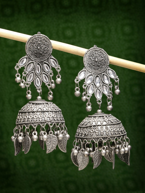 NVR Women's Silver-Plated Oxidised Artificial Stones Dome Shaped Jhumka Earrings