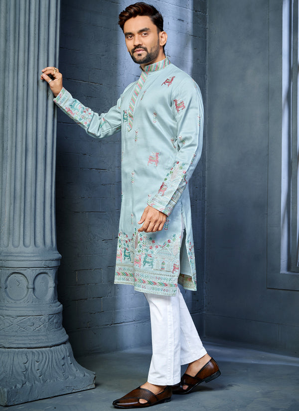 Prazu Fashion Light Sky Blue Soft Silk Multi Thread Embroidery Deer Pattern Daaman Concept Kurta
