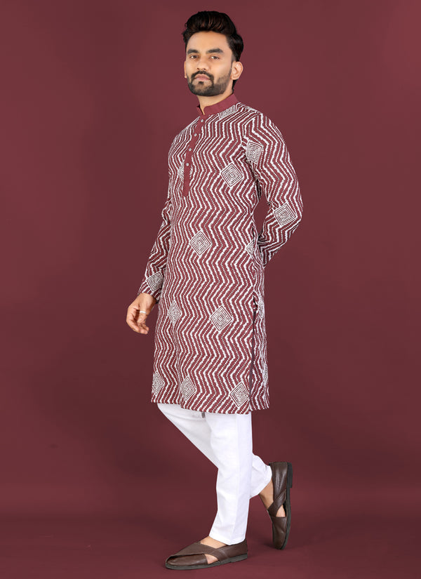 Prazu Fashion Maroon Soft Silk Unique Cross Pattern White Thread Embroidery With Silver Sequence Kurta