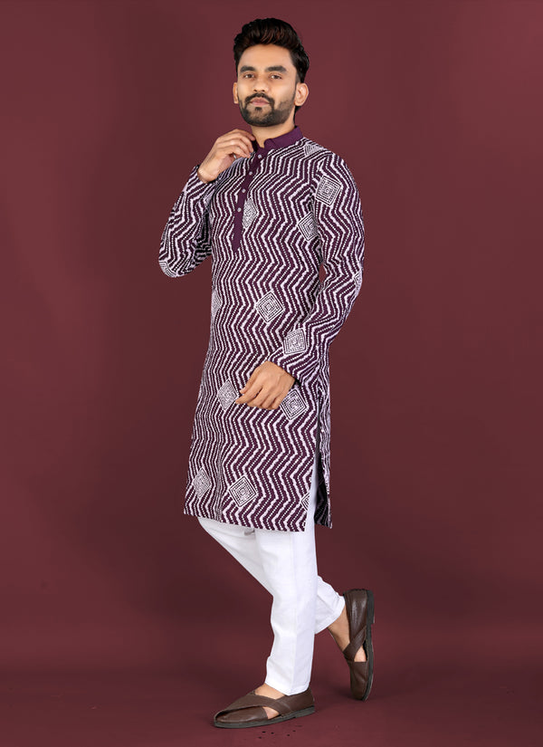 Prazu Fashion Purple Soft Silk Unique Cross Pattern White Thread Embroidery With Silver Sequence Kurta