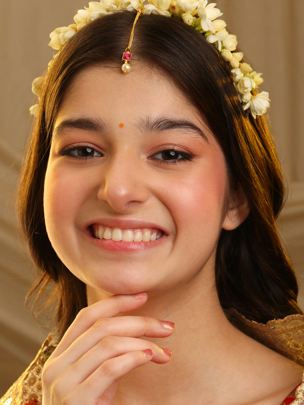 Ruby Raang Crimson Drop Pearl Maang Tikka