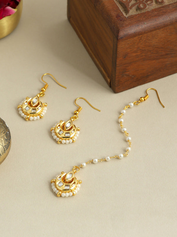Embrace the ethnic look with this gold-plated white kundan stone studded Maang Tikka and Earrings set from Ruby Raang.This studded design and exquisite kundans will give you a royal look that will surely be loved by everyone. Team with a lehenga to complete the look like a diva.Whether it’s a wedding function, festive celebration, or a special family occasion, this set feels personal—something you'll reach for when you want to look graceful, polished, and beautifully traditional. It’s not just jewellery; it’s that final touch that makes your outfit feel complete.