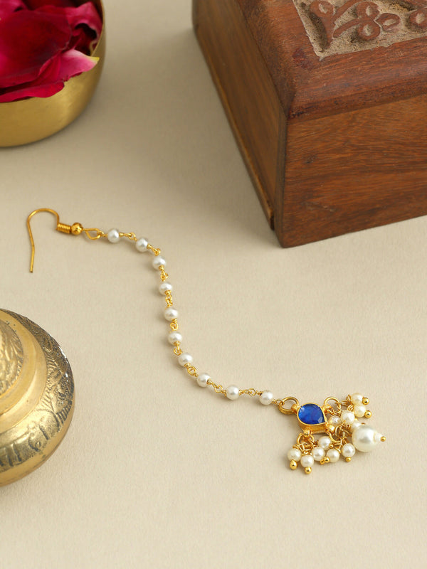 The piece features a delicate line of luminous pearl beads that sit beautifully along the hair parting. At the center, the pendant is thoughtfully designed with a rich blue stone, framed by warm gold-toned metalwork and finished with tiny pearl drops that add gentle movement and charm. The balance between the deep blue accent and the soft glow of pearls creates a look that is both regal and understated.Elegant, graceful, and versatile, it is a piece that can be cherished and worn across generations.Perfect for everyone looking to elevate their traditional ensemble, this Maang Tikka embodies beauty, and timeless craftsmanship in every detail.
