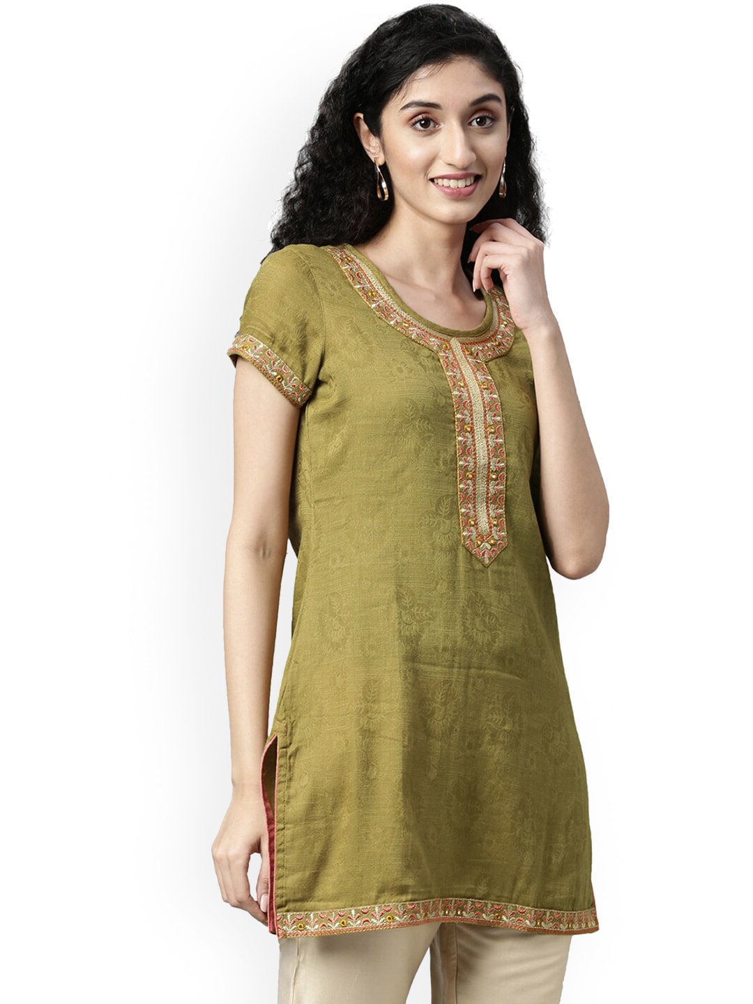 Souchii Olive Green Woven Design Kurta - S