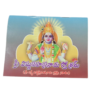 • Sri Vishnu Sahasranama Stothram comes wrapped in blue cover with an image of Lord Vishnu. In the image, Lord Vishnu is seen in his relaxed posture seated on the snake bed with its five heads guarding his head and Devi Lakshmi sitting next to the Lord.