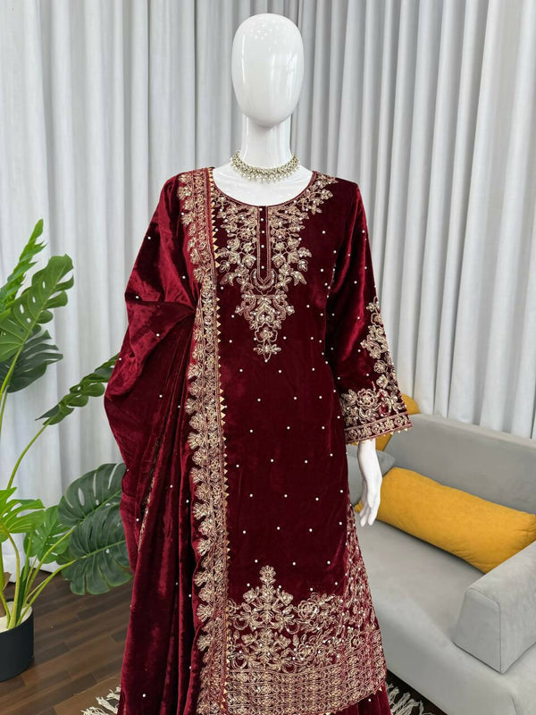 Vastranavya Maroon Viscose Velvet Cording Sequence With Moti Work Top-Bottom With Dupatta Product Details: Traditional Velvet Designer Embroidery W...